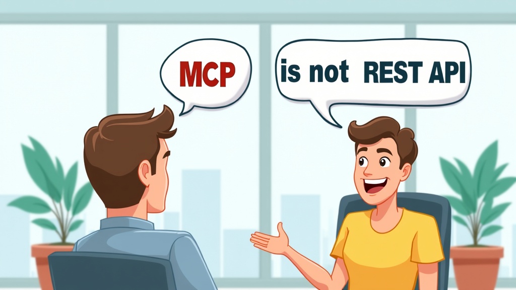 Cartoon illustration of a person explaining MCP is not REST API, showing differences, happy expression